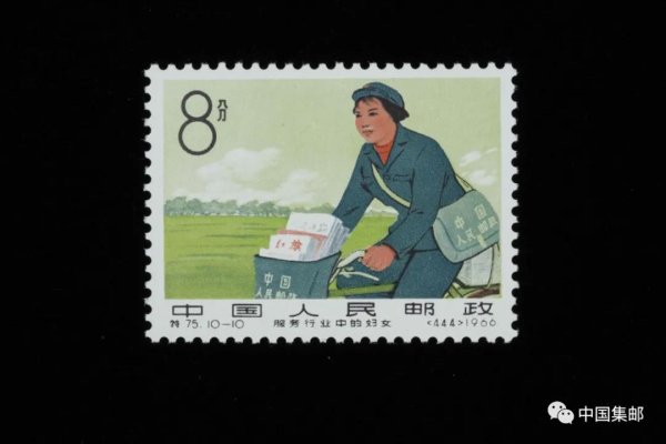1966年5月10日,邮电部发行《服务行业中的妇女》特种邮票一套10枚,第10枚图案展现了邮政战线上的乡村女邮递员形象。她身穿邮政绿色制服,肩跨印有“中国人民邮政”的绿色背包,骑着绿色自行车行驶在乡间小路上,车前装有《红旗》杂志、《人民日报》,后架上还驮着满满的邮包。