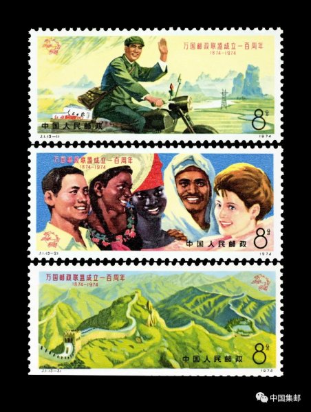 1974年5月15日发行的《万国邮政联盟成立一百周年纪念》第1枚“人民邮递员”,背景是祖国壮丽河山,邮递员驾驶一辆绿色摩托车,邮袋里装着《红旗》、《人民日报》等报刊杂志。
