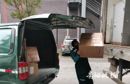 记者在观山湖区西南商贸城物流园 C 区见到熊庆国时,他刚从园区揽收了 20 余箱货物,运回转运中心准备装车。一身绿衣的他看起来并不强壮,可是从小面包车里抱出近 20 公斤的箱子却面不改色,两三步的距离,再将箱子举过头顶,放到厢式货车上去,短短 10 分钟,他的脸上就已经全是豆大的汗珠。