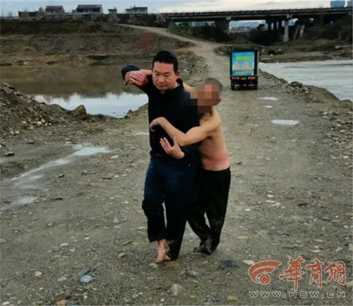 熟悉水性的他立即丢下车子脱下外套奔向河边,一头扎进水里,迅速抱起老人。