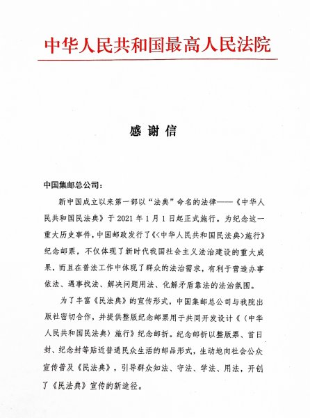 近日,中华人民共和国最高人民法院发来一封感谢信,对中国集邮有限公司在宣传普及《民法典》工作中给予的大力支持、发挥的重要作用、开辟的宣传途径、取得的良好社会效益表示衷心感谢!