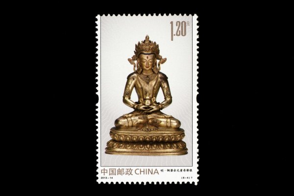 此套邮票是故宫主题邮票特展的重要展品之一。其中,第4枚邮票上的这尊无量寿佛造像,就出自观复博物馆。邮票上的佛像面庞方圆,头戴花冠,长眉细目,面带微笑,眉心镶嵌宝石,面部施泥金,双肩宽厚,腰部收束,体态匀称,结跏跌坐于双层束腰莲花宝座上,双手结禅定印,托甘露寿瓶,整体造型堪称明代造像中的上品。
