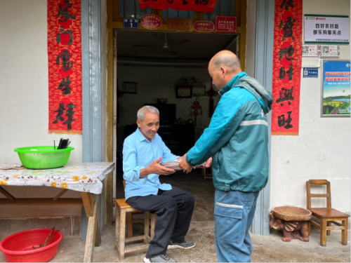 下一站是同村村民翁锡友家,他正跟几个村民一起里外忙活。看到郑卫星来了,几个人便纷纷迎上来问好,“在忙什么”“吃了没”……短暂寒暄后,几个人很默契地快速分走了郑卫星手上的信件、报刊和包裹。
