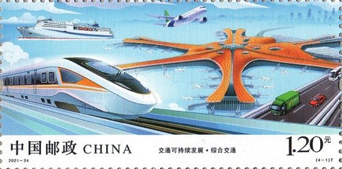该套邮票采用手绘方式表现。第一枚为综合交通,通过纵横交错的高铁、公路、机场、邮轮等多种现代化交通工具及设施,体现了高效便捷的现代化、立体化交通网络。第二枚为交通扶贫,通过高黎贡山独龙江公路隧道、独龙江乡以及往来运输的车辆等,体现了通过交通建设帮助贫困地区脱贫、促进经济发展的概念。第三枚为绿色发展,通过电动公交车和充电站、共享单车、快递车辆、港珠澳大桥、中华白海豚等元素,体现了资源集约利用、绿色发展、绿色出行的概念。第四枚为开放合作,通过中欧班列穿越国门场景、货运港等元素,体现了交通开放合作、促进发展的精神。