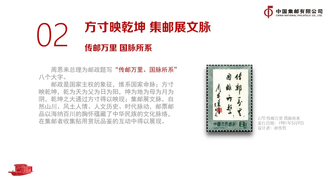 任永信以周恩来总理为林卓午先生题写的“传邮万里,国脉所系”作为本章开篇,强调了邮政的使命担当。一是以文化人、以文化心。方寸映乾坤,集邮展文脉。邮票通过古代先贤、节日节气、大好河山、文学名著、古代绘画、传统戏曲、民间传说等系列将中国传统优秀文化一一呈现,彰显文化自信。二是国家富强、人民幸福。邮票记录下了十八大以来,我国在经济、政治、文化、社会等领域取得的瞩目成果,展现了新时代、新气象、新作为。三是铭记历史、服务社会。邮政以“政”字为先,2003年的“非典”、2020年以来的“新冠”,中国邮政都冲锋在前、担当使命。去年,中国邮政仅捐赠邮票和邮品收入一项就共计4370万元,是历年来中国邮政发行抗疫救灾邮票捐赠总额最高的一次。