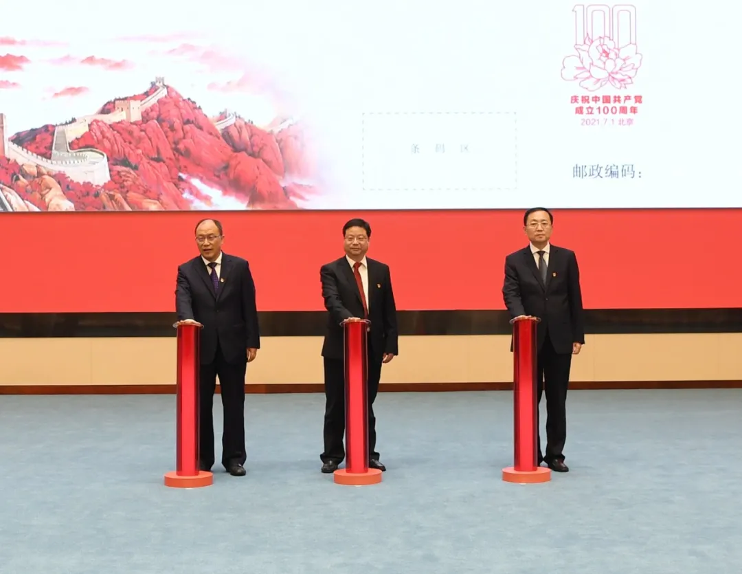 蒋建国(中)、马军胜(右)、刘爱力共同为《中国共产党成立100周年》纪念邮票揭幕
