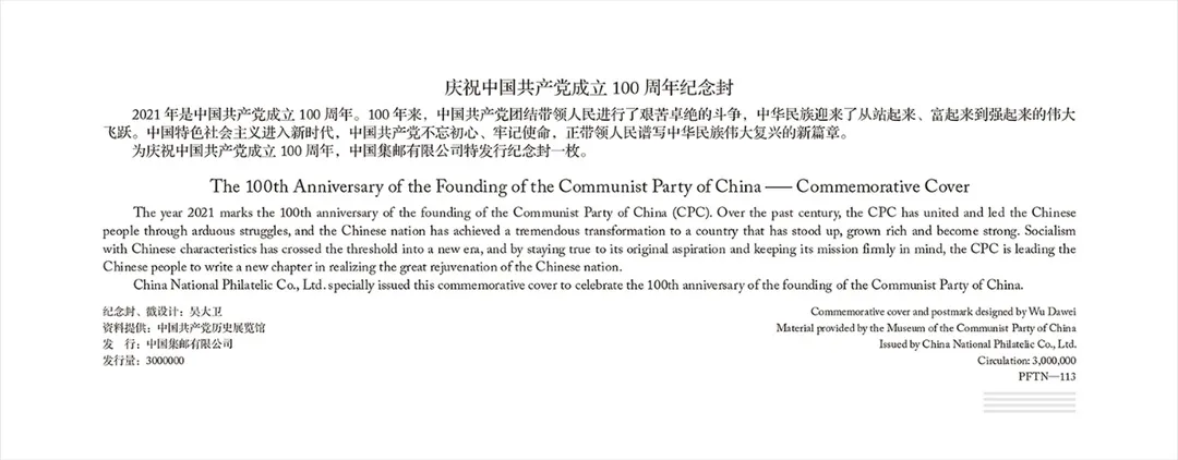 2021年6月29日,《中国共产党成立100周年》纪念邮票和纪念封在中国共产党历史展览馆隆重发布。中共中央宣传部副部长蒋建国,国家邮政局党组书记、局长马军胜,中国邮政集团有限公司党组书记、董事长刘爱力出席发布仪式并为《中国共产党成立100周年》纪念邮票揭幕,国家邮政局党组成员、副局长戴应军,中国共产党历史展览馆馆长吴向东,中国邮政集团有限公司党组成员、副总经理康宁为《庆祝中国共产党成立100周年》纪念封揭幕。中国邮政集团有限公司党组成员、副总经理王俭主持。