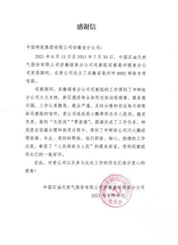 今年8月份,亳州市分公司还收到了来自中国石油天然气股份有限公司安徽亳州销售分公司的感谢信,感谢亳州市分公司在安徽销售分公司巡察期间提供的高质量邮政服务。