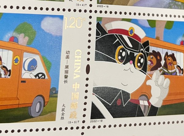 《黑猫警长》是我国第一部科普动画系列片,讲述了机智、勇敢、帅气的黑猫警长率领警士痛歼搬仓鼠,侦破螳螂案,消灭“一只耳”等一个又一个危害森林安全的案件,令森林中的各种动物过上安枕无忧日子的故事,深受孩子们的喜爱,成为八九十年代少年儿童的美好记忆。 该套邮票由尚盈设计,表现了动画中制服强盗、捉捕恶鹰、保卫家园、并肩作战、大获全胜5个故事情节,突出展现了黑猫警长英姿飒爽、智勇双全的经典动画形象。整体设计延续动画系列邮票的设计形式,并采用蒙太奇的表现手法,将不同的场景和镜头进行重组、拼接和色彩强化,画面主体突出、色彩鲜明、动态丰富、场景连贯,在静止的邮票中展现出一幕幕经典场景,重现经典动画形象。 该套邮票采用影写版工艺印制,色彩明快、饱和度高,并且同时采用了金、银两种特种金属墨,金色的文字使得邮票面值和铭记光彩闪耀,银色的轮廓线条为黑猫警长的形象赋予了金属光泽,更加凸显了黑猫警长的“主角光环”。