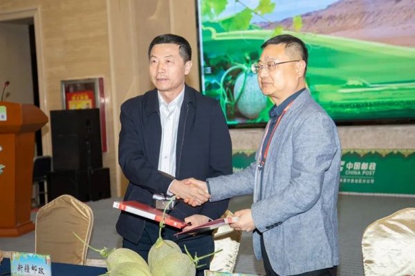推介会现场,新疆区邮政分公司副总经理姚新根与上海邮乐网络技术有限公司董事长李唐签订了哈密瓜购销框架合作协议,新疆区邮政分公司渠道平台部与吉林省、广西省邮政分公司渠道平台部签订了合作协议,吐鲁番市邮政分公司与石家庄市邮政分公司、新疆塞外疆君有限公司签订了合作协议。