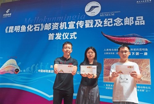 “5·18”国际博物馆日当天,《昆明鱼化石》邮资机宣传戳及系列纪念邮品首发仪式在西北大学博物馆举行。此次发行的《昆明鱼化石》邮资机宣传戳及明信片、信封一套,邮资机宣传戳以昆明鱼化石及昆明鱼复原图为主图,明信片以寒武纪早期生态复原图为画面进行设计,信封用手绘图的方式展示昆明鱼与“西大动物”的形象区别,并展现生物从鱼到人的进化过程。