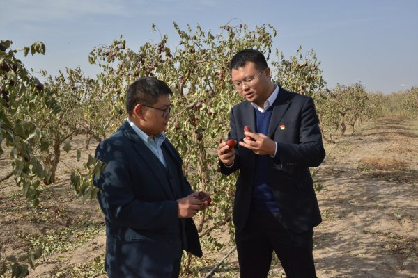 伍晓越(右)来到枣林实地考察大枣品种及质量