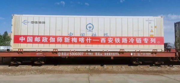 8月28日,由新疆维吾尔自治区邮政分公司承运的960吨伽师新梅搭乘冷链班列奔向西安中转、销往全国各地,这是今年新疆邮政开行的首趟新梅冷链专列。