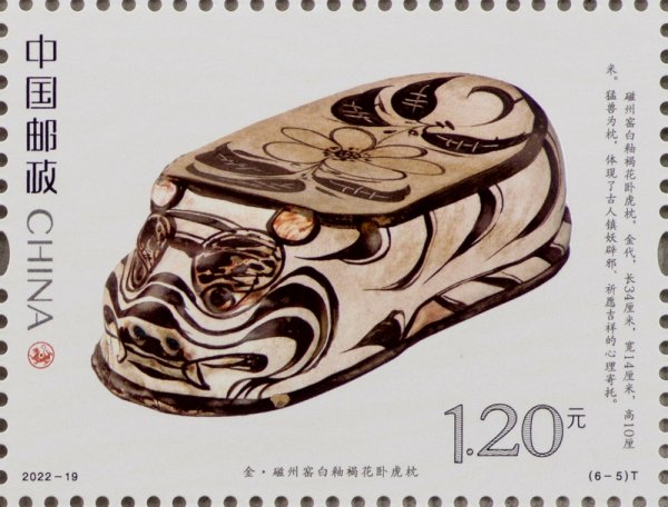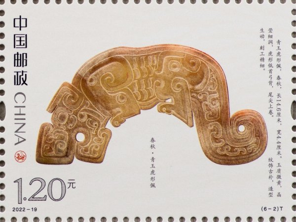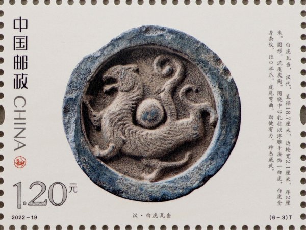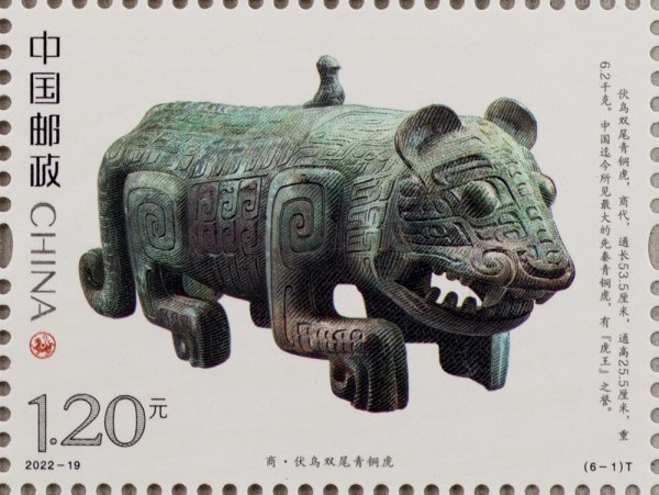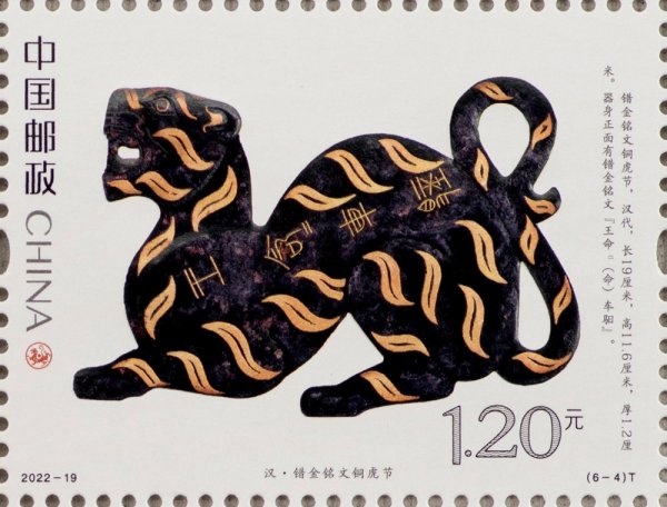 中国邮政定于2022年9月5日发行《虎(文物)》特种邮票一套6枚。邮票图案名称分别为:商·伏鸟双尾青铜虎、春秋·青玉虎形佩、汉·白虎瓦当、汉·错金铭文铜虎节、金·磁州窑白釉褐花卧虎枕、清·皮影飞虎。全套邮票面值为7.20元。