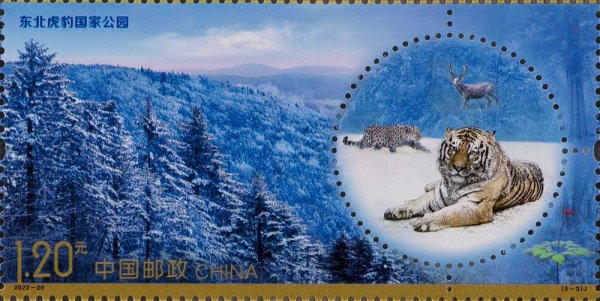 东北虎豹国家公园总面积1.41万平方公里,横跨吉林、黑龙江两省,是我国野生东北虎、东北豹最主要的繁育和活动区域。这里也是温带森林生态系统的典型代表。目前,园区内生态持续向好,有蹄类动物种群结构和规模保持健康状态。邮票表现了东北虎、东北豹、梅花鹿、人参、红豆杉等元素。