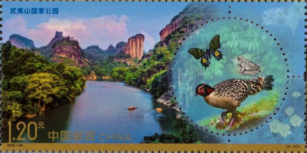 武夷山国家公园总面积1280平方公里,横跨福建、江西两省,是中亚热带森林生态系统典型代表、东南动植物宝库、世界文化和自然双遗产地,被中外生物学家誉为“天然植物园”“鸟的天堂”“蛇的王国”“昆虫的世界”“研究亚洲两栖爬行动物的钥匙”。邮票表现了福建假稠李、千里光、黄腹角雉、武夷林蛙、金斑喙凤蝶等元素。