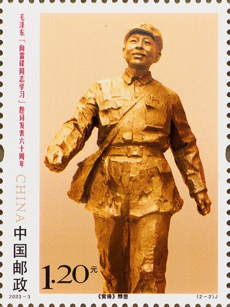 中国邮政定于2023年3月5日发行《毛泽东“向雷锋同志学习”题词发表六十周年》纪念邮票一套2枚,邮票图案名称分别为毛泽东同志题词、《雷锋》雕塑。全套邮票面值2.40元。邮票计划发行数量为750万套。