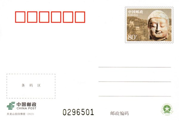 中国邮政定于2023年11月16日发行《天龙山回归佛首》普通邮资明信片l套1枚。详情如下: