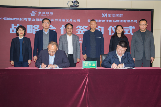 11月28日,中国邮政集团有限公司新疆维吾尔自治区分公司与霍尔果斯汉使国际物流有限公司签署战略合作协议。新疆邮政分公司党委书记、总经理宁俊伟,党委委员、副总经理唐新磊,霍尔果斯经济开发区兵团分区党工委副书记、管委会副主任薛利,霍尔果斯汉使国际物流有限公司董事长胡习泉及相关部门负责人出席签约仪式。