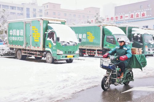 湖北省武汉市邮政分公司在做好人员、车辆安全防范的情况下,揽投部全部正常对外服务;投递员迎雪而上,提前到岗,做好车辆检查、邮件分拣等班前准备工作。同时,合理规划投递路线,抓紧时间出班,及时将邮件安全、高效送到市民手中。