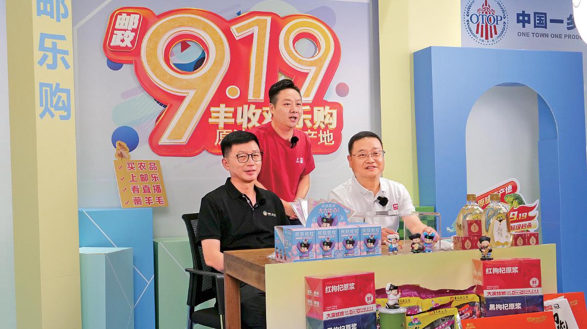 李唐(右)、中国民族贸易促进会会长蓝军(左)走进邮乐直播间为优质农品“带货”。