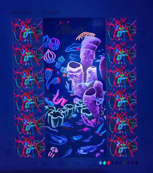 主图邮票中的地理位置示意图,采用红绿蓝三色荧光油墨印刷。其中,红色交通线设计了两种亮度的荧光效果,以突出交通要道的主次。全真彩荧光工艺,也为附图部分的37个海洋古生物,增添了意想不到的效果,在紫外灯下观察时,这些古生物会呈现出色彩斑斓的发光效果。这种设计与澄江化石地邮票的主题——寒武纪时期海底古生物在高亮日光照射后会反射荧光的效果紧密契合,带给大家更加丰富而神秘的视觉体验。