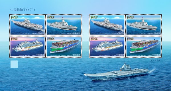 《中国船舶工业(二)》特种邮票是邮票设计师沈嘉宏的方寸新作,邮票遴选了代表我国先进造船水平的4种船舶类型,展现了中国船舶近年在海洋防御以及海洋运输(包括海洋客运和海洋货运)等领域取得的辉煌成就,也是继2015年6月3日发行的《中国船舶工业》邮票之后,中国邮政发行的该系列第二组邮票。第一组《中国船舶工业》邮票曾描绘了航天测量船、薄膜型液化天然气运输船、海上浮式生产储油船、导弹驱逐舰,本次发行的《中国船舶工业(二)》将一展航空母舰——山东舰、055驱逐舰、中国首制大型邮轮、全球首款23000TEU双燃料动力集装箱船4种海上巨轮的风姿。