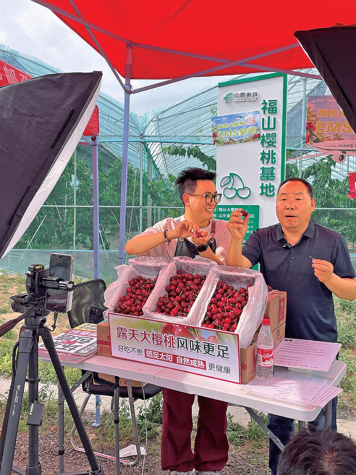 邮政员工与当地合作社负责人在大樱桃基地进行现场直播。 □李雯娅 摄