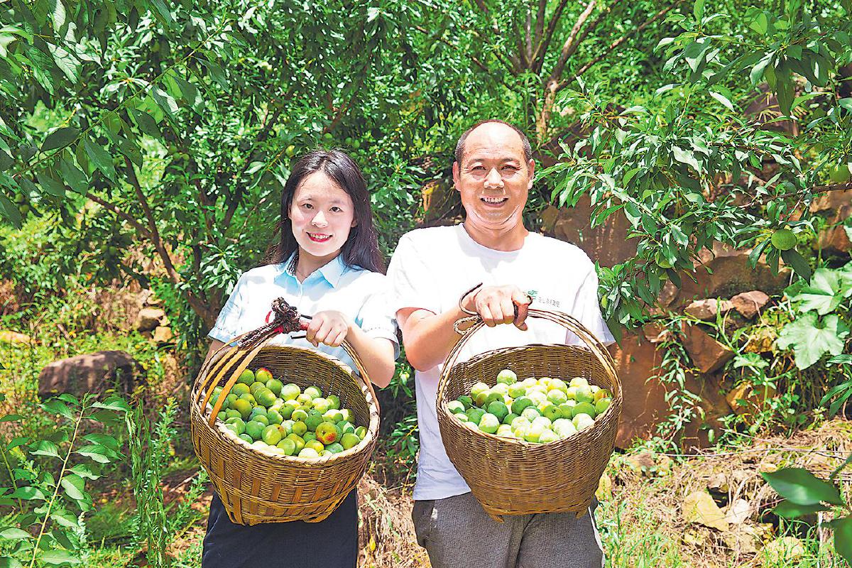 邮政员工与种植户一起采摘脆李,共享丰收喜悦。
