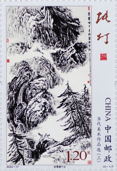 一图《老雪凝千古》原画作者为张仃,创作于1988年,为张仃先生焦墨山水代表作之一,现藏于中国美术馆。该枚邮票采用胶雕联合印刷工艺,画作以黑白色调为主,利用雕刻线条刻画这幅美术作品内容,能够最大程度还原原画的神韵。二图《白云黄鹤》由周令钊和陈若菊二人合作,为湖北武汉黄鹤楼一楼主壁画,原画藏于中国美术馆。该枚邮票采用胶印工艺,高精度胶印使得屋檐、窗户、人物表情等诸多图案细节展现得惟妙惟肖。三图《我的祖国·我的人民》原画作者黄永玉,创作于2003年,以抒情的彩墨语言塑造了一位白衣天使形象,现藏于中国美术馆。该枚邮票采用影写工艺,通过高饱和度和色彩鲜艳度来实现邮票的设计精髓。