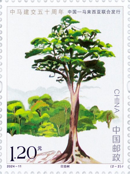 中国邮政定于2024年5月31日发行《中马建交五十周年》纪念邮票1套2枚,该套邮票与马来西亚联合发行,邮票图案名称为松树、印茄树。全套邮票面值2.40元。邮票计划发行数量为665万套。