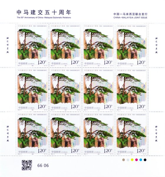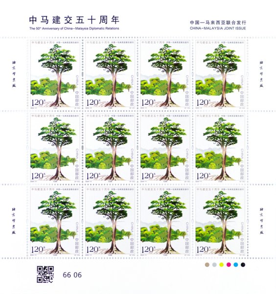在中国,松树常见于古代绘画及诗词中,作为坚强、优雅以及长寿的象征被赞扬。邮票画面中表现的迎客松已经有800余年历史,如同伸出胳膊迎接远道而来的客人,如今的迎客松已经成为中国与世界人民和平友谊的象征。印茄属于大型乔木,一般分布在东南亚和太平洋群岛上,在马来西亚的马来半岛和沙巴、沙捞越都有生长。印茄树高可达45米,质地坚硬,常用于造船业和家具制造业。印茄树被认为是马来西亚国树,象征马来西亚在永续管理和保护生物多样性上的成果,并象征着森林对国家工业和经济的重要性。