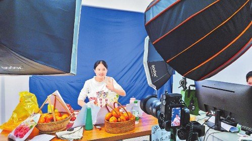 平乐邮政主播在电商直播间推介柿子系列产品。  □唐何溪 摄