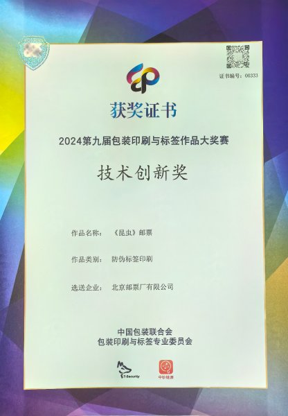 在中国包装联合会主办的2024第九届中国包装印刷与标签作品大奖赛中,我公司选送的《昆虫(二)》邮票荣获技术创新奖。