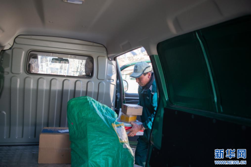 1月19日,在林芝镇邮政所,邮递员索朗次仁把准备派送的快递装车。