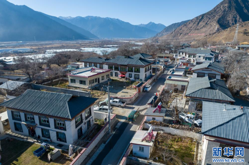 1月19日,西藏林芝市“邮快合作”新配备的邮递车穿行在乡村小巷(无人机照片)。