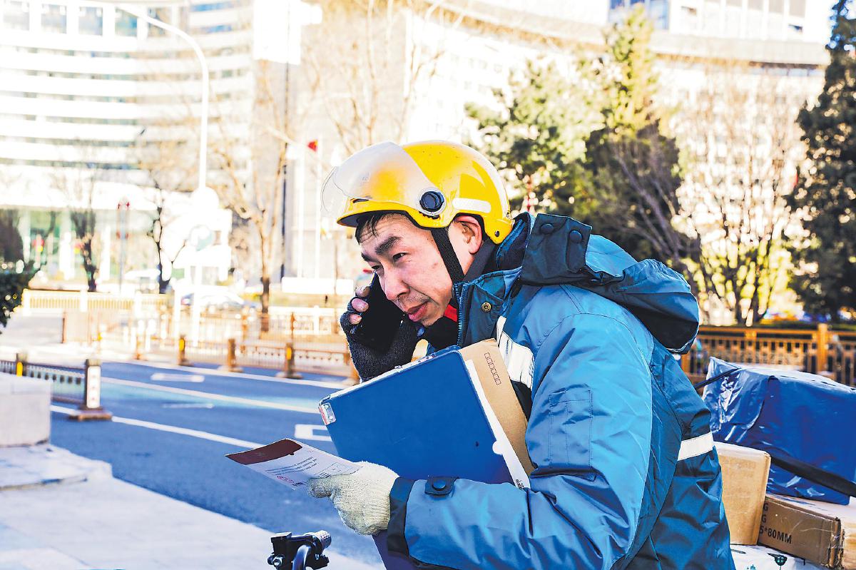 近几日,受寒潮影响,西北、华北等地出现大风天气,降温明显。邮政投递员克服天气影响,按时出班,将一件件传递“温暖”的包裹及时、准确送达客户手中。图为2月7日上午,北京市东城区建内大街邮政支局投递员张业田冒着寒风穿行在胡同与大厦之间,按时送出100多件包裹和300多份报纸。