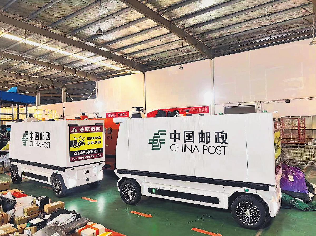 邮政无人配送车在南陵县寄递物流共配中心等待装邮件。 □孙康 摄