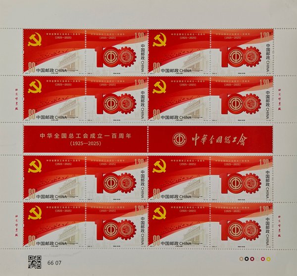 中国邮政定于2025年5月1日发行《中华全国总工会成立一百周年》纪念邮票1套2枚,邮票图案名称为:亿万职工心向党、团结奋斗新征程。全套邮票面值2.00元,计划发行数量570万套。
