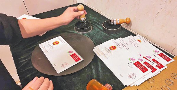 3月5日,邮政工作人员为全国两会纪念封加盖纪念戳。一枚枚纪念封,用邮政语言记录两会时刻。