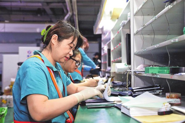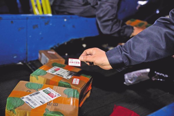 3月2日,北京邮政工作人员为快件粘贴“北京已安检”标识,严格落实寄递安检措施,筑牢全国两会期间寄递渠道安全防线。