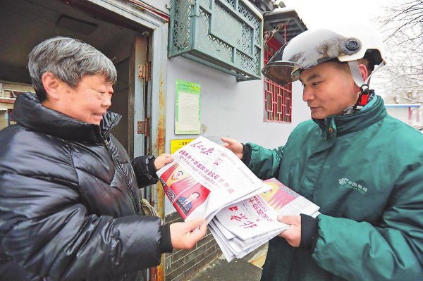 3月5日9时30分,北京东四邮政支局投递员送达当日《人民日报》。