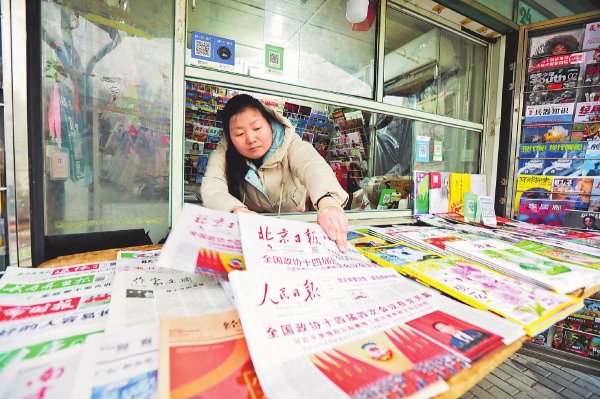 3月5日,北京西城区广安门外大街报刊亭,工作人员整理“两会专架”,确保刊载两会报道的党报及时与市民见面。