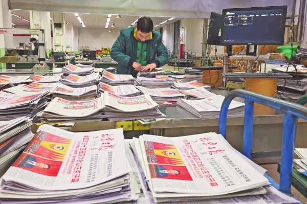 3月5日清晨,首批刊载两会报道的党报运抵发行中心,邮政工作人员争分夺秒开展分拣作业,确保两会声音第一时间传递到千家万户。